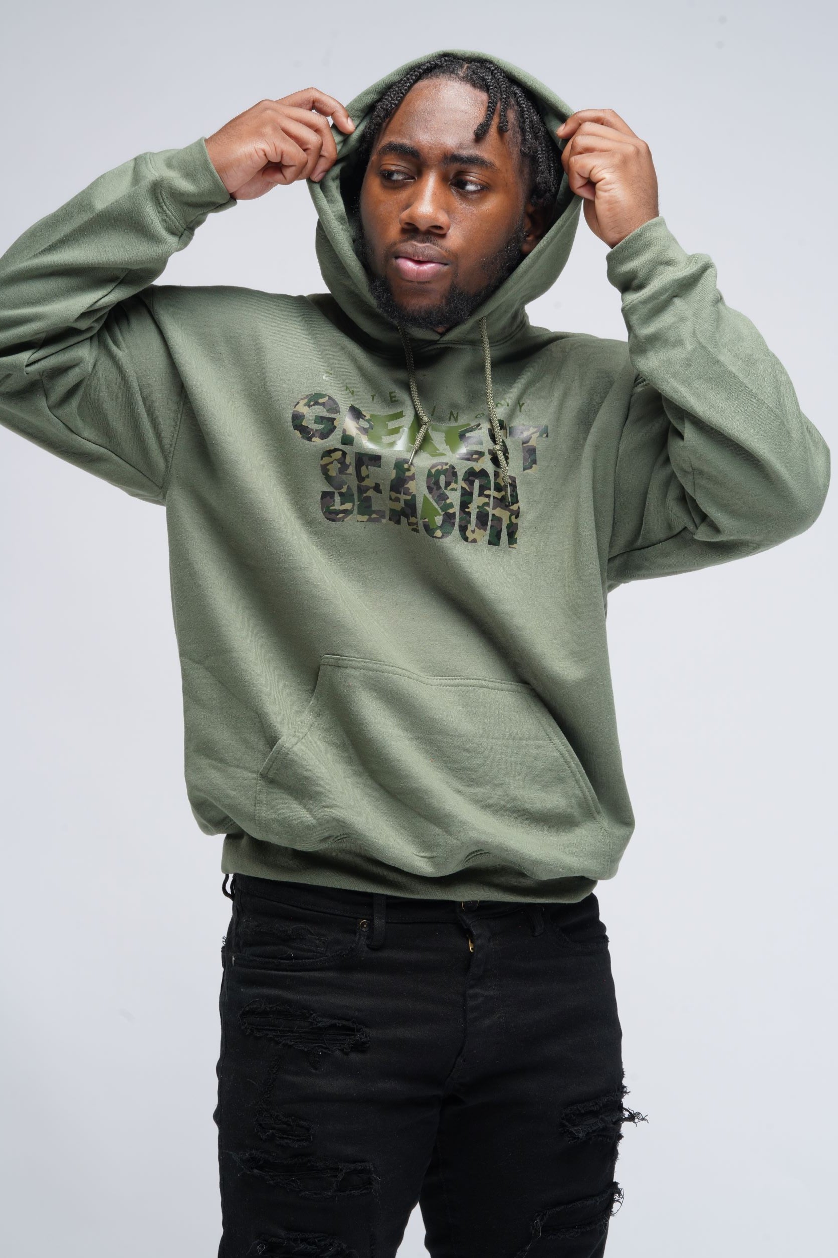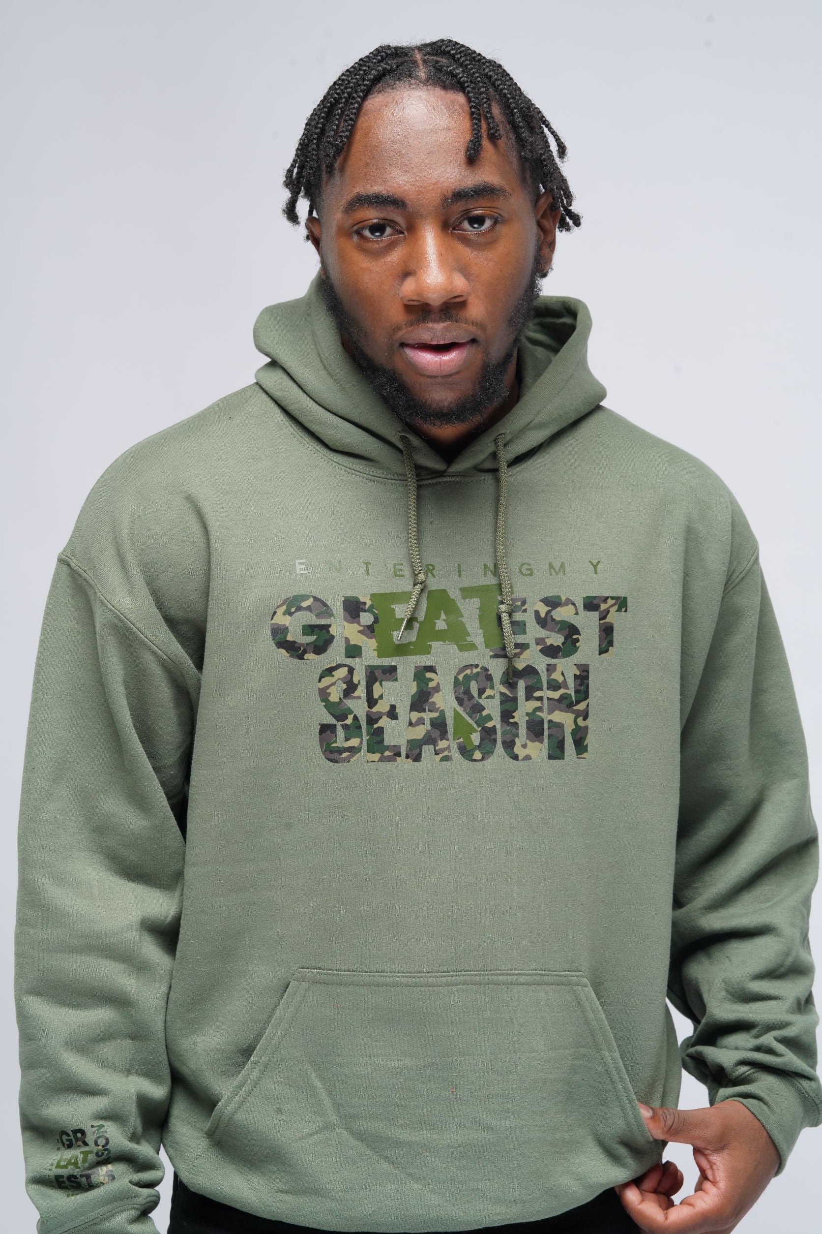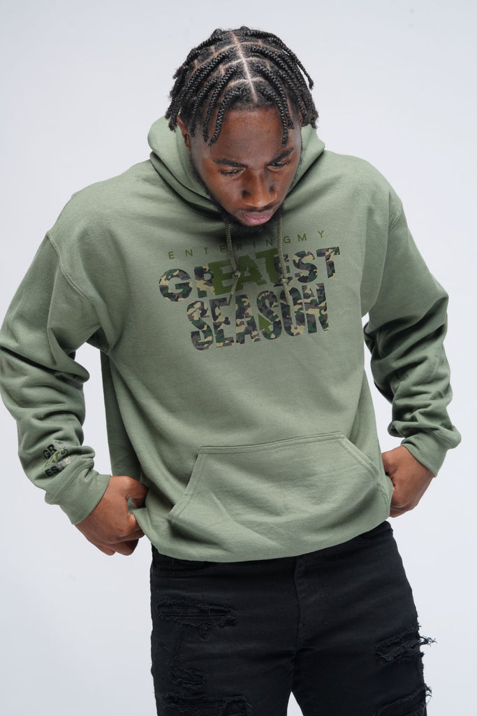 Entering My Greatest Season Unisex-Hoodie. Olive w/ Camo Lettering "The Solider"