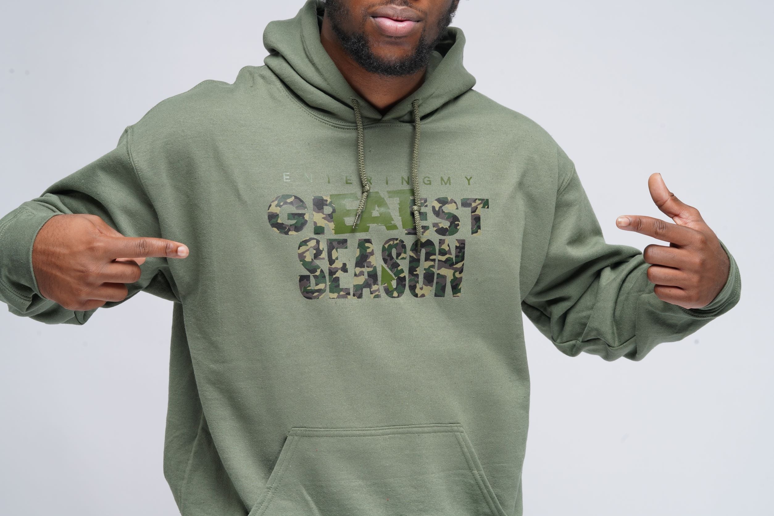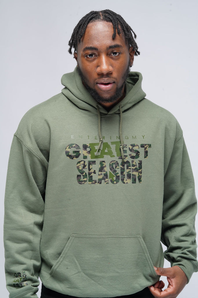 Entering My Greatest Season Unisex - Hoodie. Olive w/ Camo Lettering. Support those who serve by wearing the EMGS Camo Hoodie.
