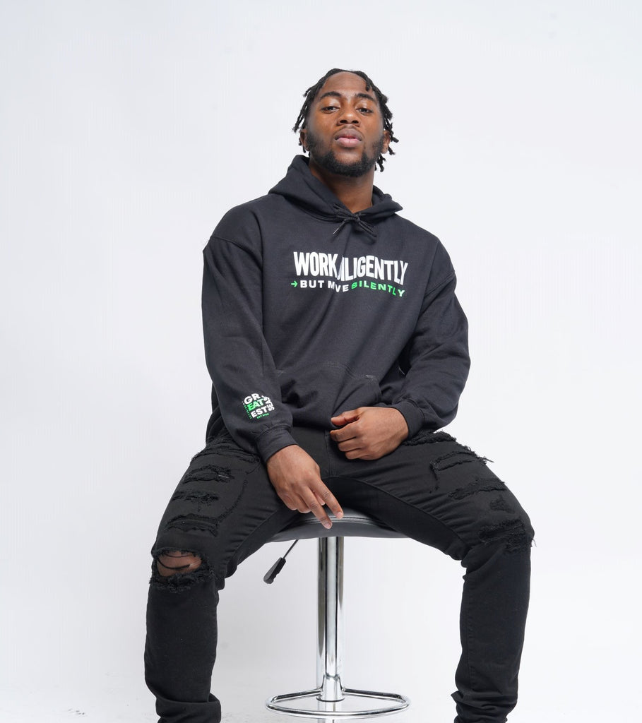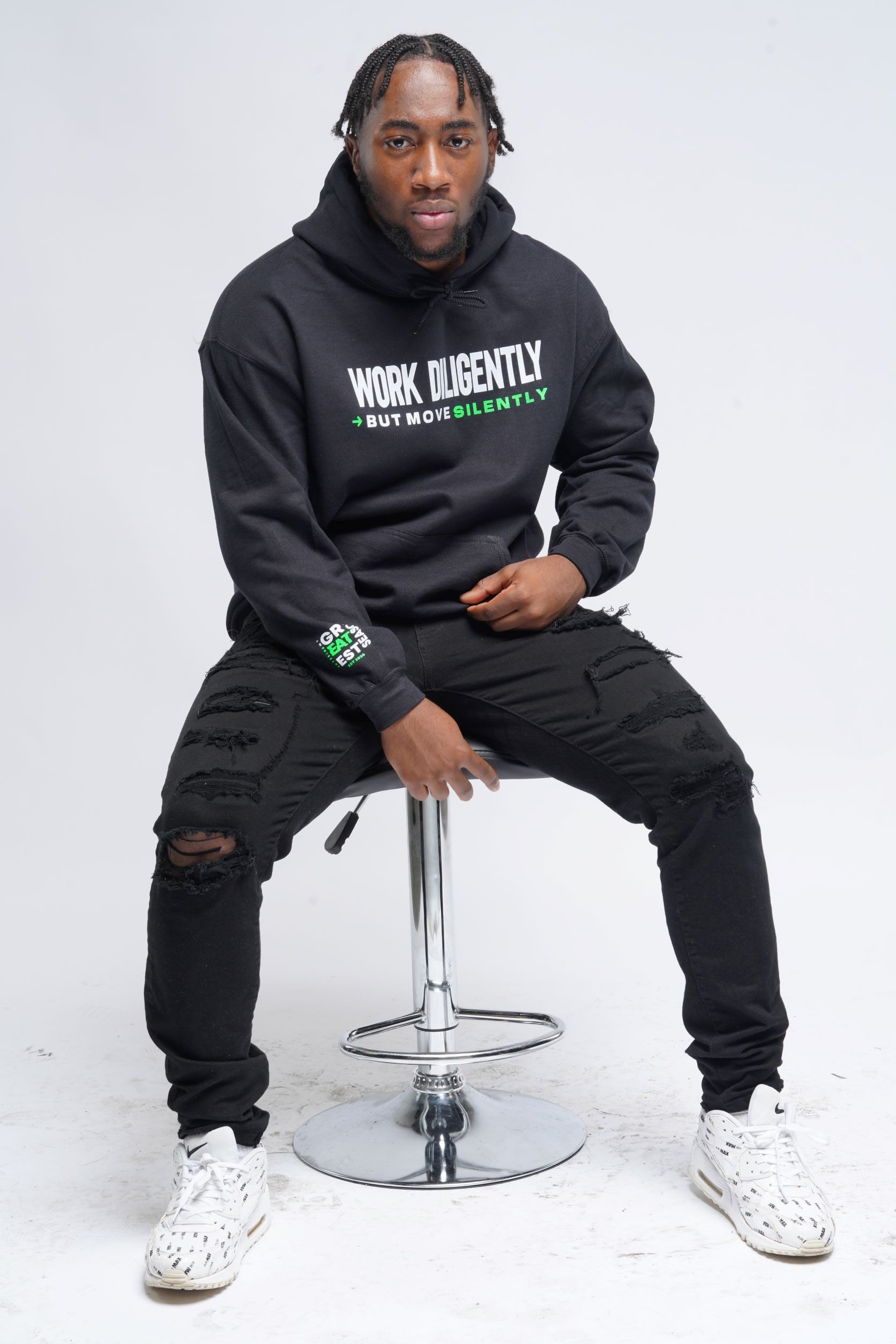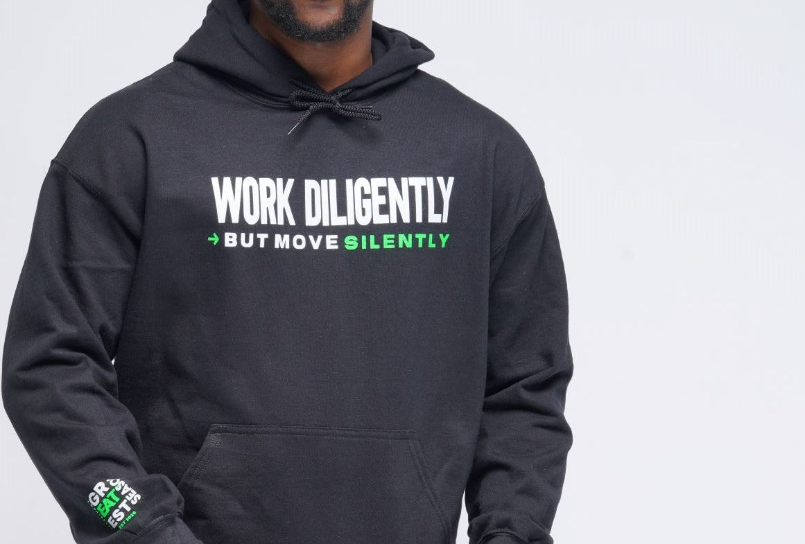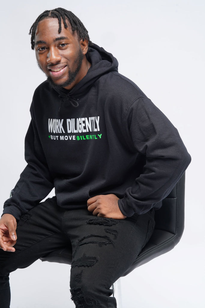 Entering My Greatest Season: Diligently/ Silently Unisex Hoodie- White and Green Lettering.
